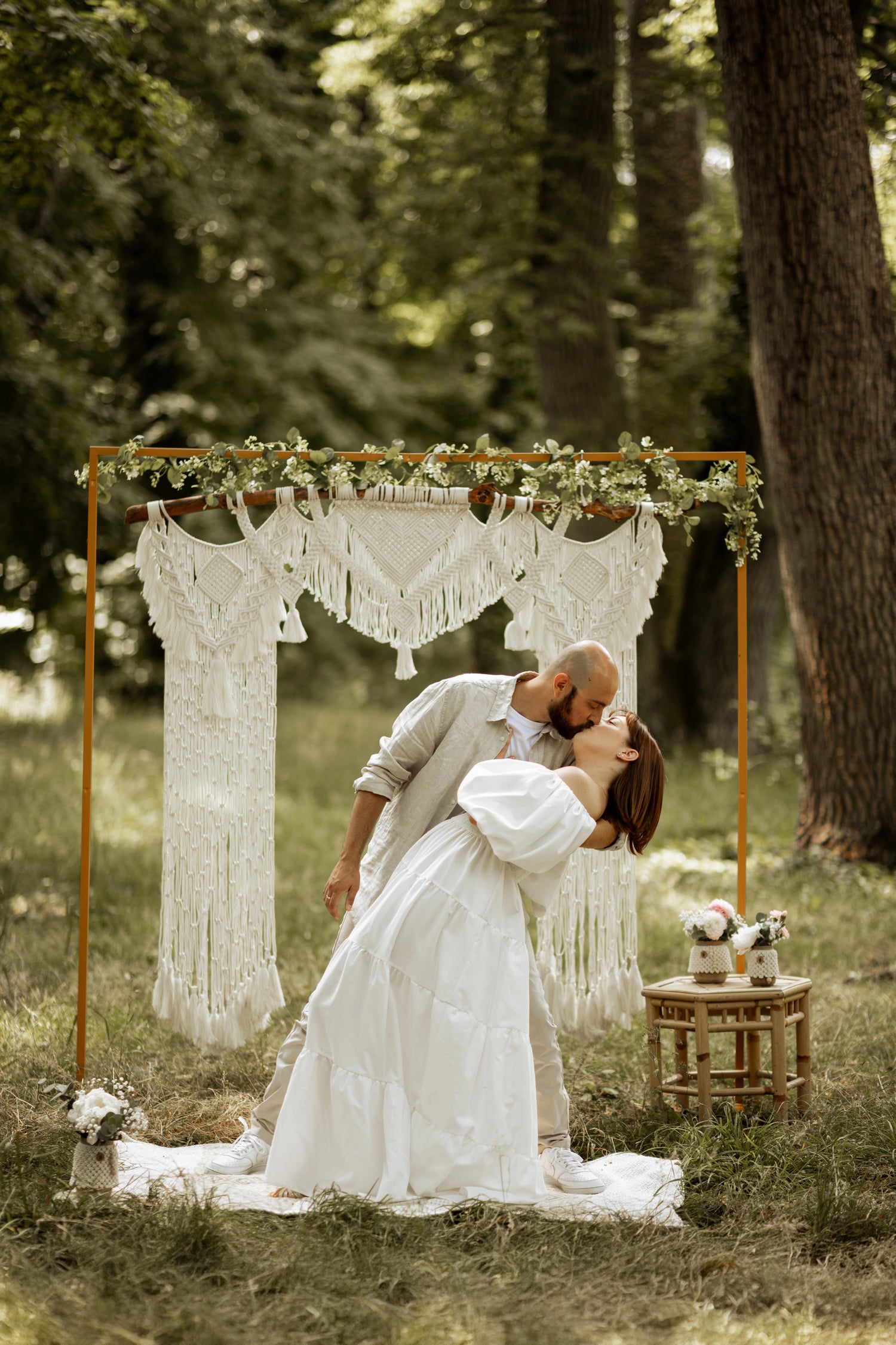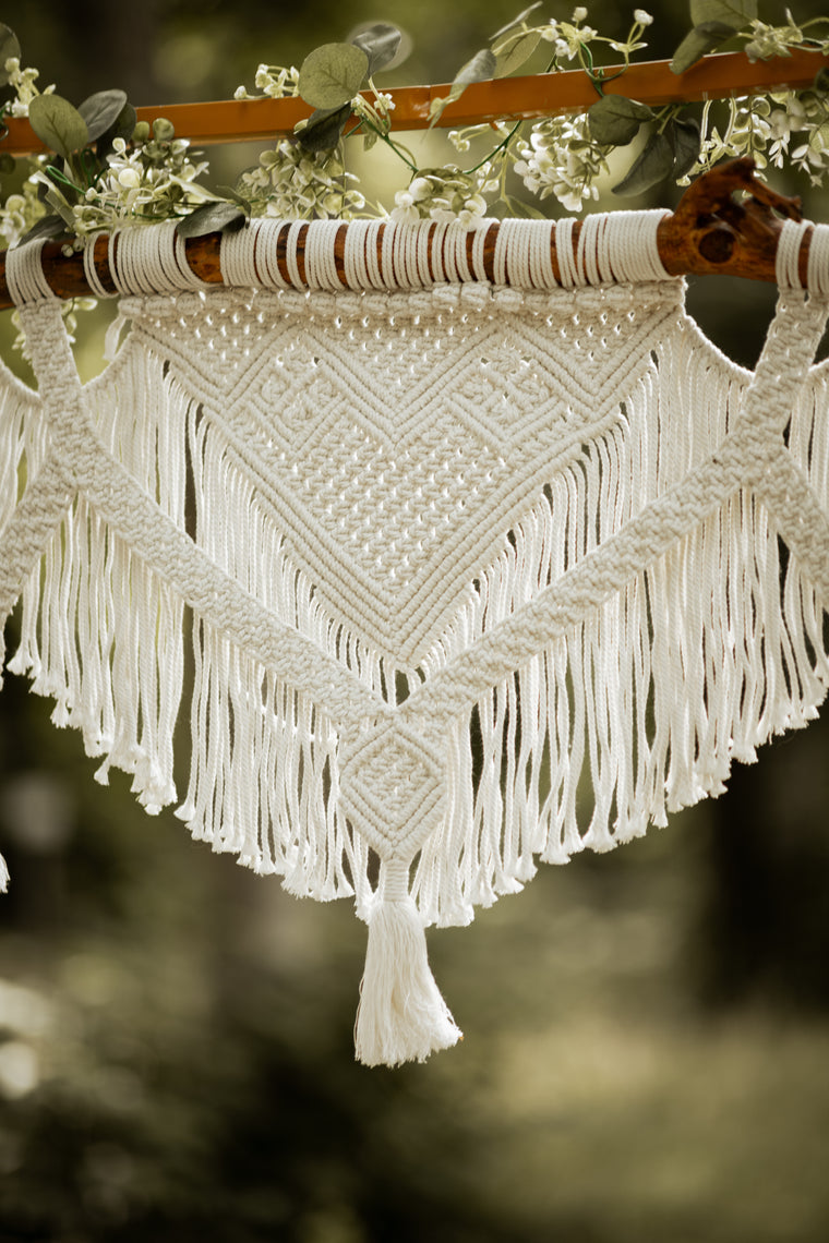 Arche en macramé et accessoires faits main se mêlent pour créer une atmosphère chaleureuse, naturelle et élégante.