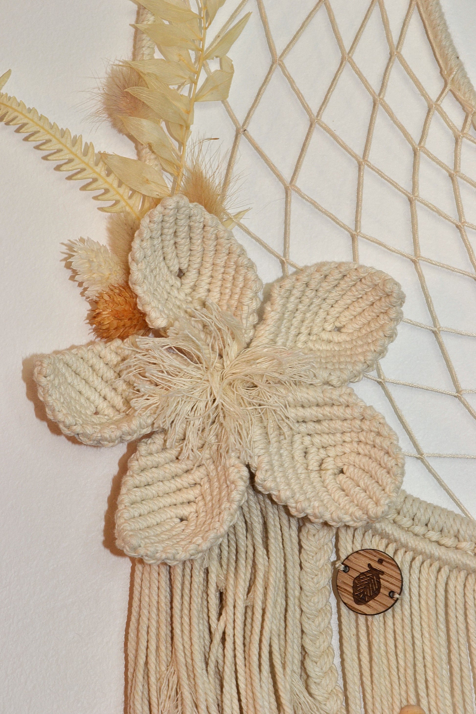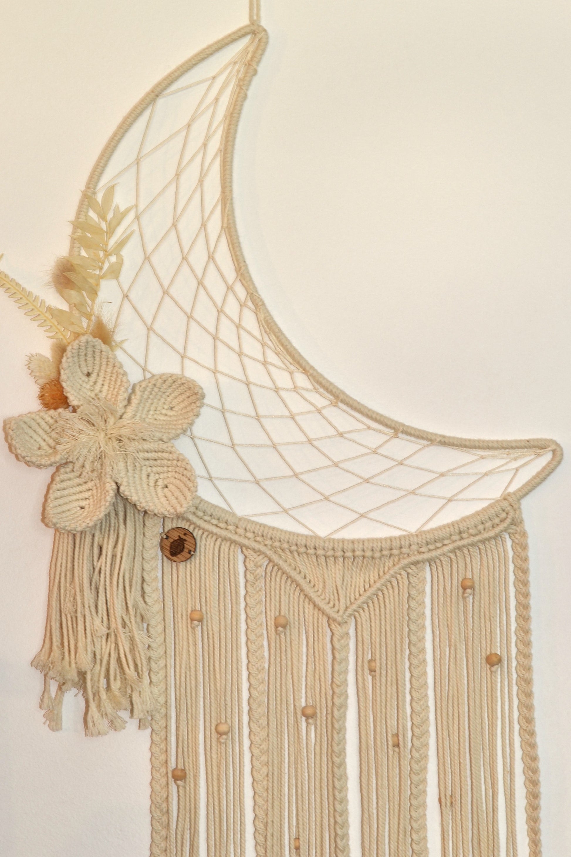Plongez dans un univers de douceur avec Luna, un attrape-rêves artisanal en macramé conçu sur un anneau en forme de lune, orné de fleurs séchées et d'une fleur en macramé