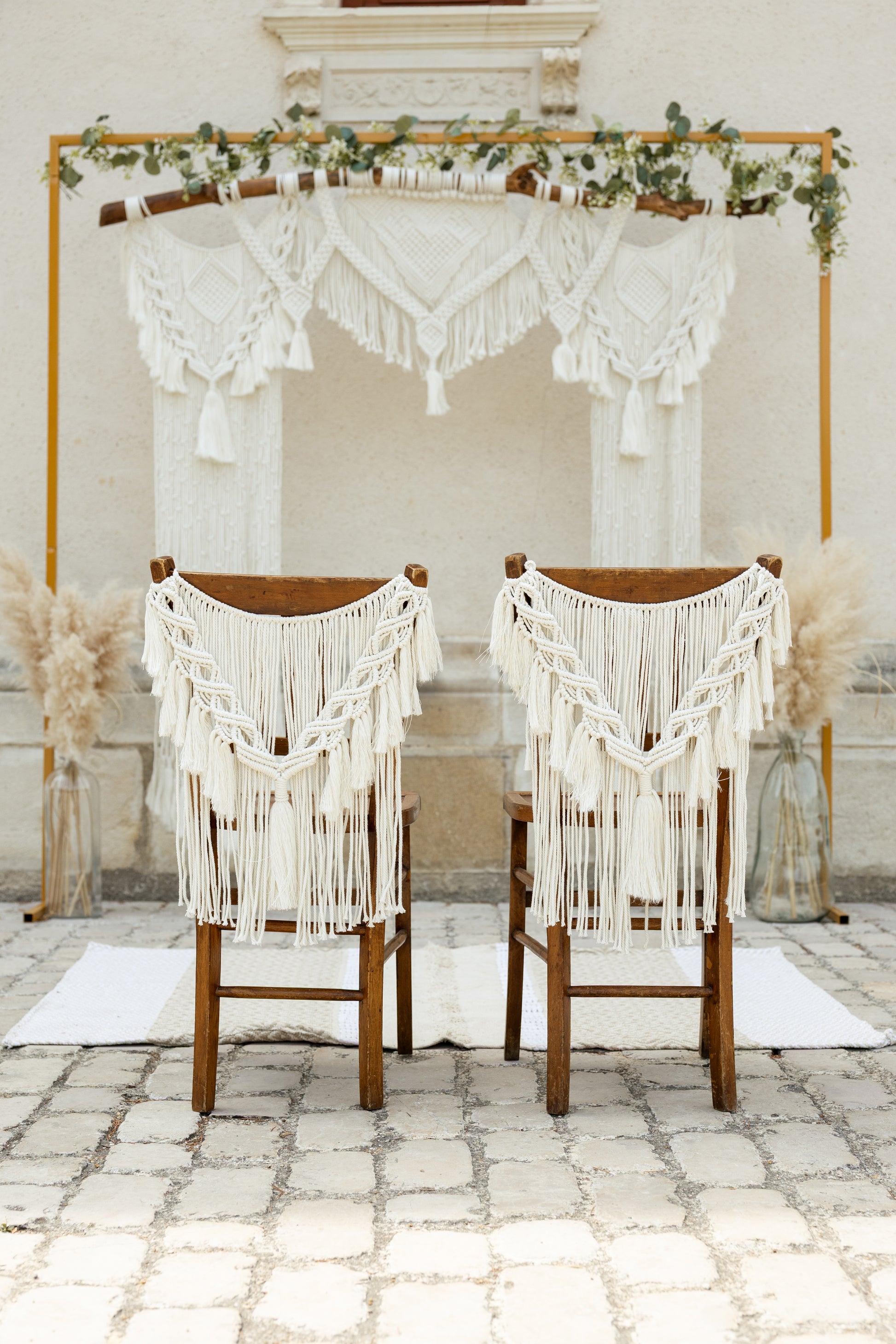 Apportez une note douce et élégante à vos événements grâce à ces dos de chaises en macramé artisanaux.
