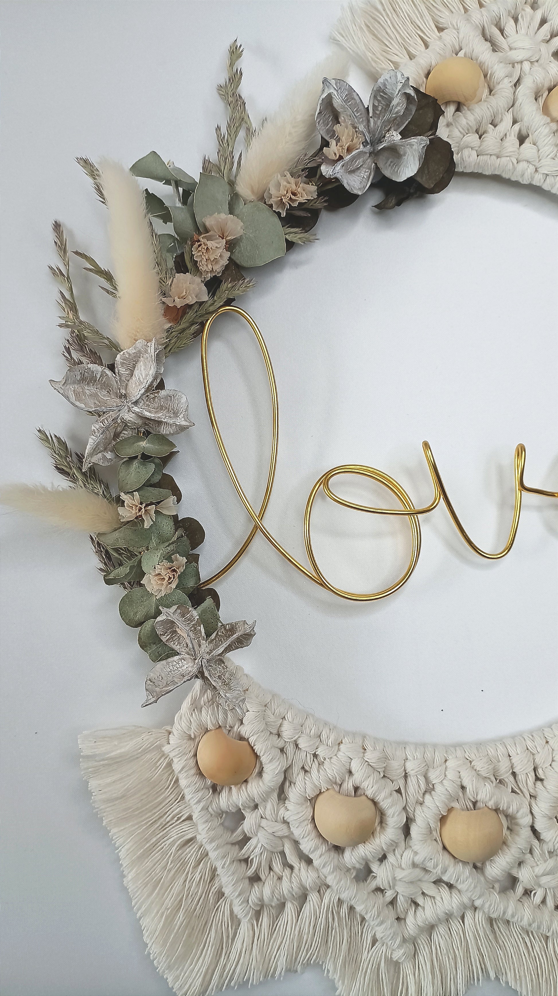 Il est orné de fleurs séchées et de perles en bois. Le mot "love" est confectionné avec un fil d'aluminium coloris or.
