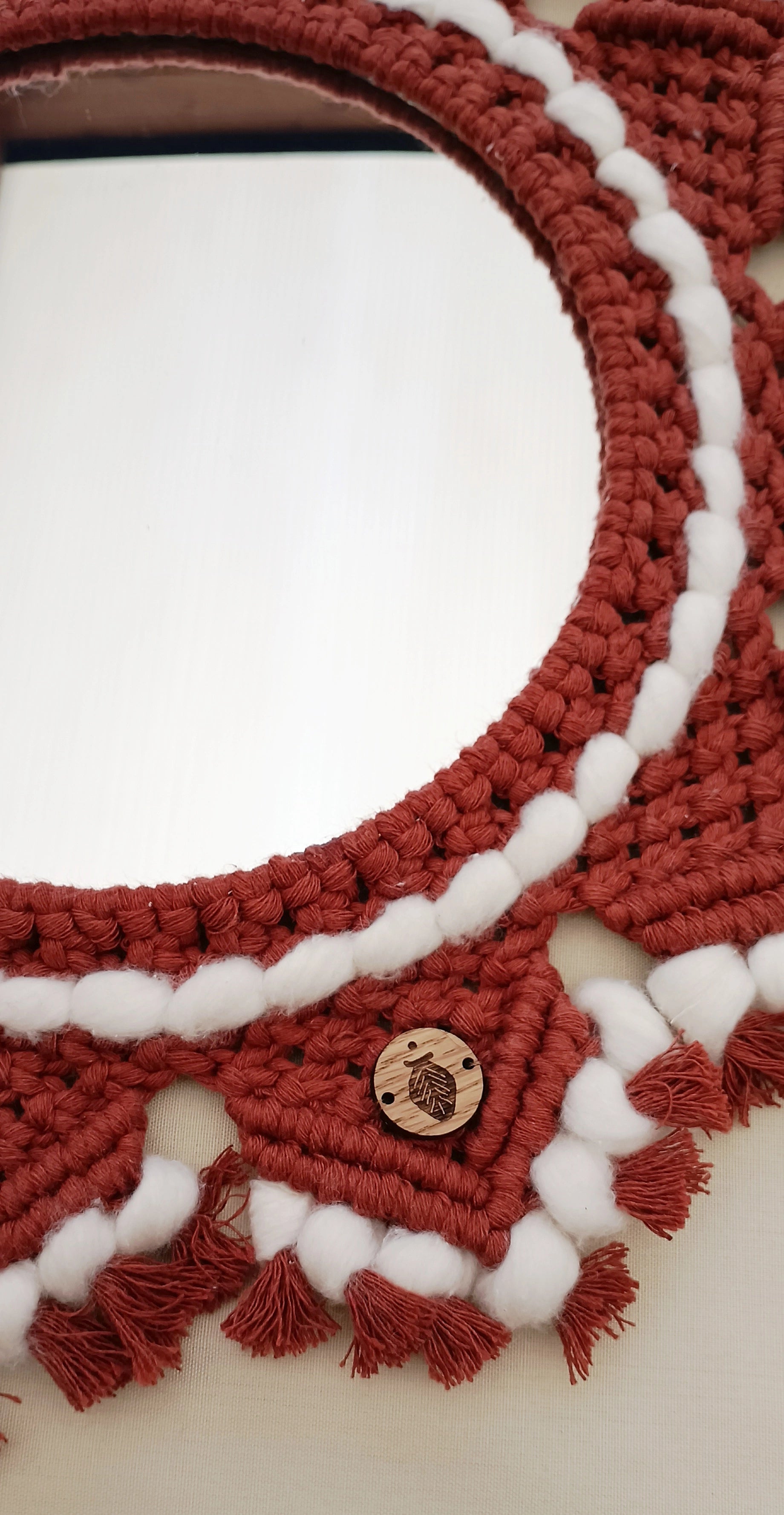 Ce miroir en macramé est une pièce unique que je peux reproduire sur commande. Pour cela, je vous invite à m'envoyer un mail à : marie.papiercoton@gmail.com ou via le formulaire de contact.