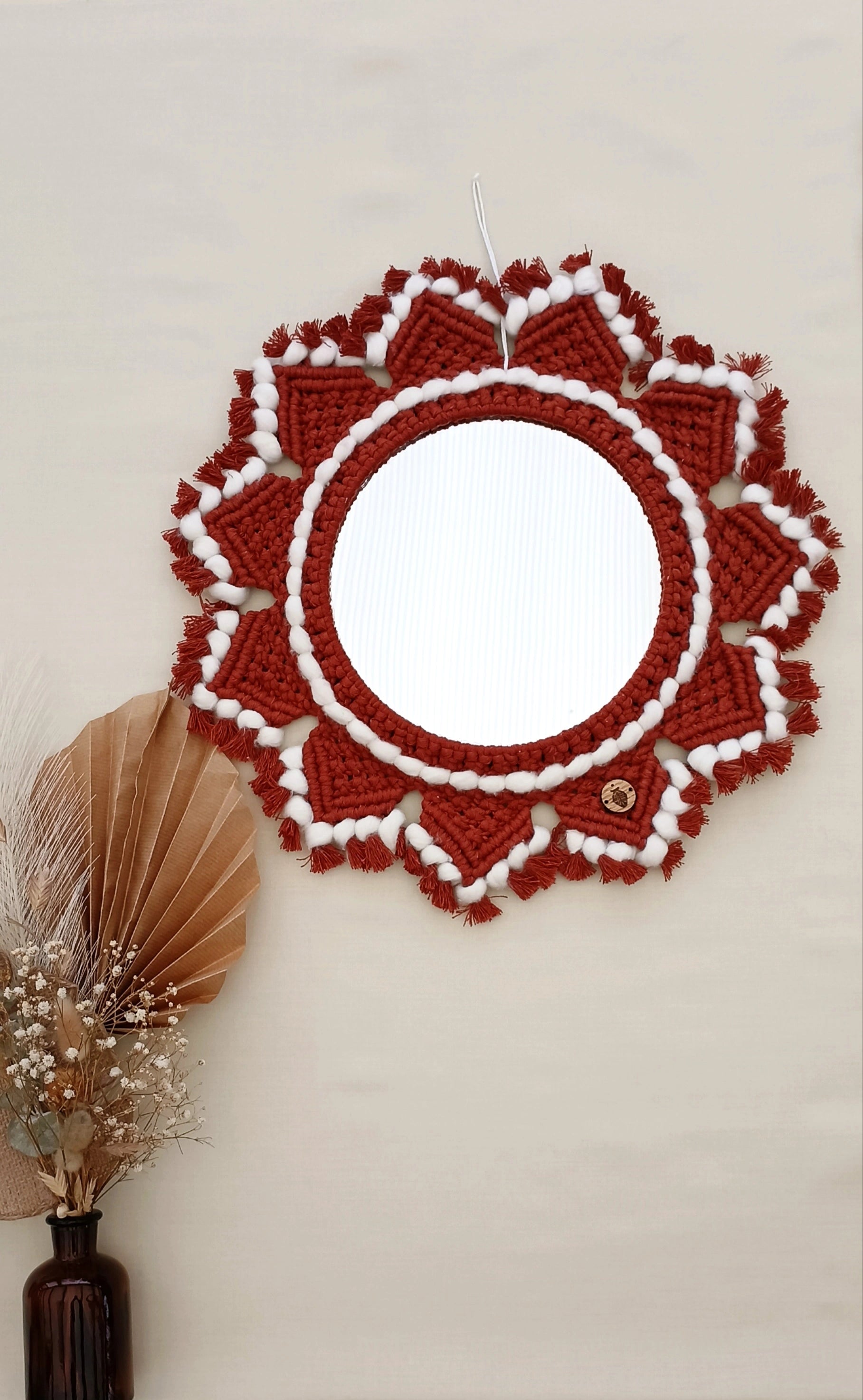 Ce miroir en macramé, à l'allure d'une fleur, est entièrement réalisé à la main, à partir de coton peigné de couleur terra cotta, certifié OEKO TEX. Des soupçons de coton duveteux ramènent à une ambiance cocooning,