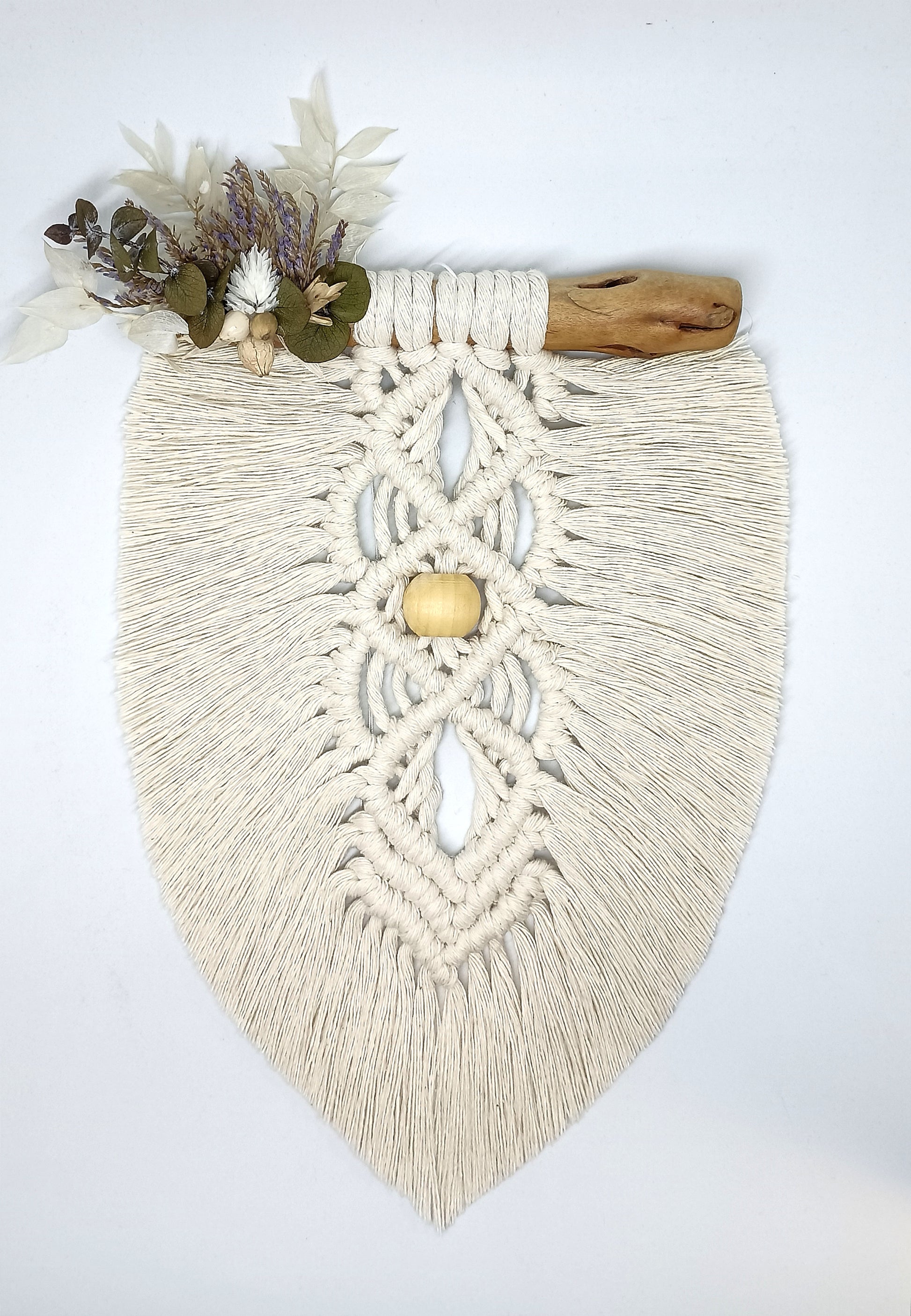 Accrochée à un morceau de bois flotté, et ornée de fleurs séchées délicatement choisies, elle s'inscrit dans une inspiration bohème.